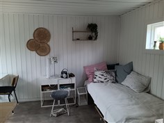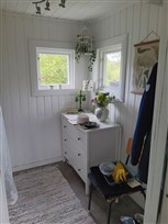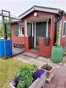 Stugan har ett stort rum som består av kök med induktionsplatta, kylskåp med frysfack, matplats och säng. Det finns en veranda, en paviljong med löstagbart tak samt ett enklare utekök. På stugan finns s.k ryggsäck för förvaring av verktyg trädgårdsredskap. Utvändigt är stugan i behov av målning, invändigt är stugan renoverad 2021.